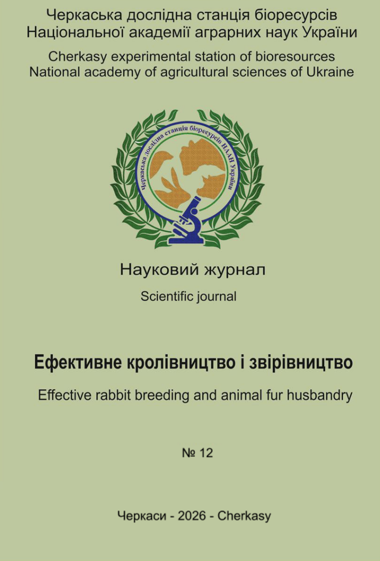 obtained from PS59 males prevailed over their peers descended from Hyla Max males, Termond White breed, and Poltava Silver breed by 4.3% (p ≤0.01), 8.0%, and 16.7%, respectively. The slaughter yield of rabbits of the experimental genotypes ranged from 52.1 to 54.6% and was highest in young rabbits whose parents were PS59 males. It was found that the rabbits obtained from PS59 males had the highest flesh and bone mass, which is logical, since they were characterized by the highest live weight. However, due to the higher bone weight, the meat yield of rabbits of this genotype was the lowest (77.2%), while in young rabbits obtained from Hyla Max males and Termond White breed males, it was 2.7 (p ≤0.001) and 2.5% higher, respectively. A similar situation was observed with the meatiness coefficient – it was highest in rabbits with the 1/2HM1/2NG genotype, with young rabbits from males of the Termond White breed lagging behind by only 0.04 units, and the lowest in rabbits whose parents were PS59 males, with the difference being significant (p ≤0.01). The moisture, protein, fat, and ash content of the longest back muscle samples from rabbits of the experimental genotypes was examined. Based on the results of studies of the chemical composition of meat from rabbits descended from different males, it can be stated that meat obtained from rabbits whose parents were males of the Termond White breed is characterized by a higher content of protein, fat, and ash, which may indicate its higher biological value.